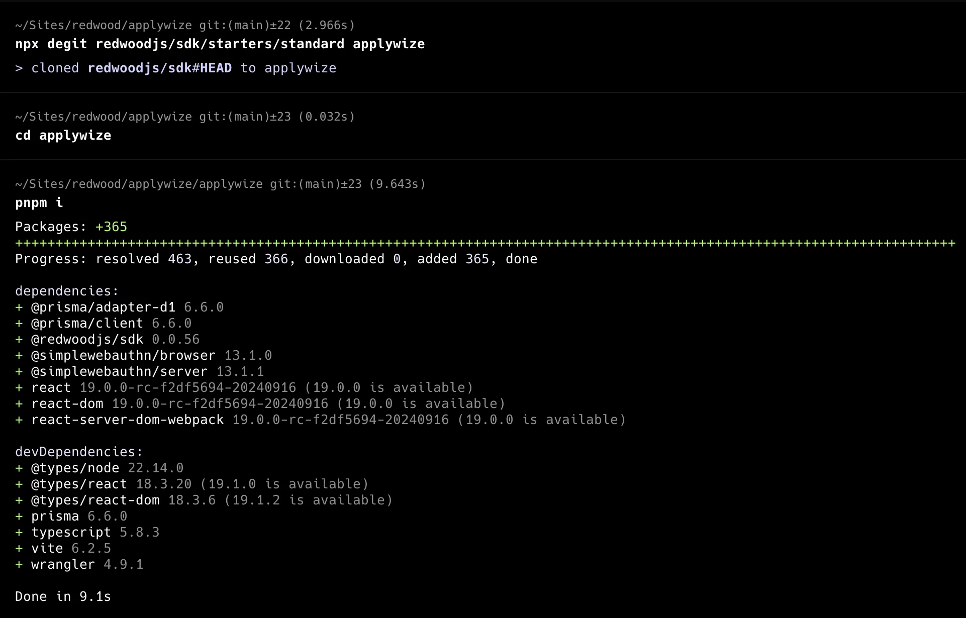 This will create a new RWSDK project called applywize, inside a directory called applywize, using the standard starter project template, install the dependencies, and run the development server.